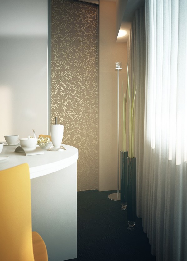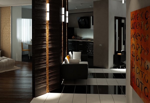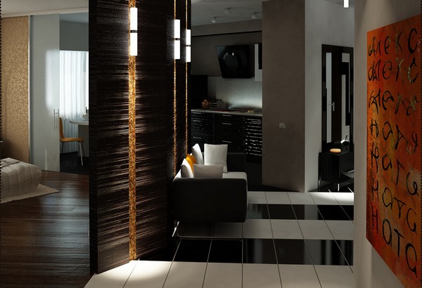Το κύριο έργο αυτού του χώρου ήταν η δημιουργία και η δυνατότητα του να απολαύσετε τον ήλιο στο ανώτατο όριο: Στο εσωτερικό κυριαρχή η άχρωμη κλίμακα (μαύρο, λευκό, γκρι), είναι γεμάτο από απροσδόκητες φωτεινές πινελιές: υφάσματα, μαξιλάρια, την ταπετσαρία των καρεκλών, αξεσουάρ , κουρτίνες. Η καρδιά του σπιτιού είναι ένα ανοιχτό καθιστικό που ενώθηκε με την κουζίνα. Και μια τέτοια ένωση δεν είναι περιστασιακή. Αυτό είναι και το πιο ζεστό μέρος που συγκεντρώνει τον καθένα σαν μαγνήτης. Tα γυάλινα χωρίσματα διακοσμημένα με ένα λεπτό μοτίβο λουλουδιών και συρόμενες πόρτες κάνουν το εσωτερικό απλόχωρο και ευάερο. Πόρτες από γυαλί ματ δίνουν άλλη πνοή στο χώρο. Η συνολική άνεση συμπληρώνεται με διακοσμητικές πινελίες του δημιουργου με μικτές τεχνικές γραφικού και μοντέρνου.