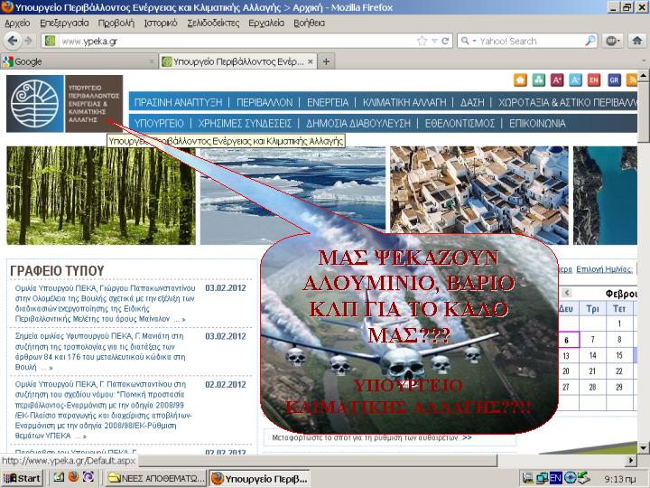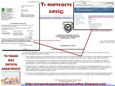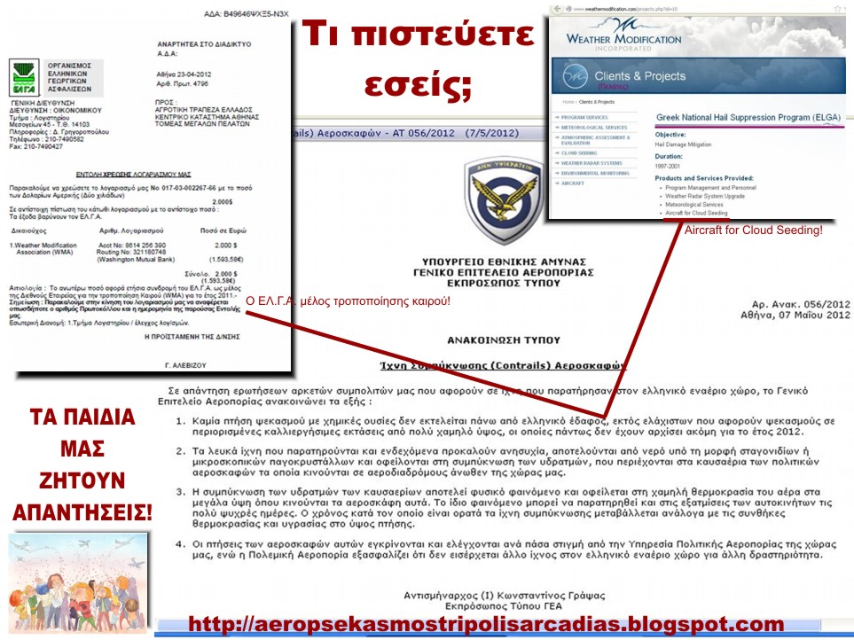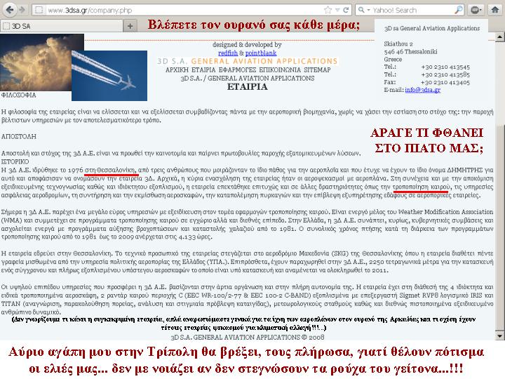 2. Την ιστοσελίδα http://3dsa.gr της εταιρείας 3D S.A. που βρίσκεται στην οδό Σκιάθου 2 στην Θεσσαλονίκη και σε συνεργασία με την αεροπορική βιομηχανία, κάνει αεροψεκασμούς για την τροποποίηση του καιρού της χώρας μας. Η εν λόγω εταιρεία συνάπτει κυβερνητικές(!) συμβάσεις και ελέγχει το κλίμα της Ελλάδας από το 1981, που μέχρι το 2009, έχει κάνει πτήσεις προγραμμάτων τροποποίησης καιρού 4.133 ώρες(!) όπως η ίδια αναφέρει και ρωτούμε: