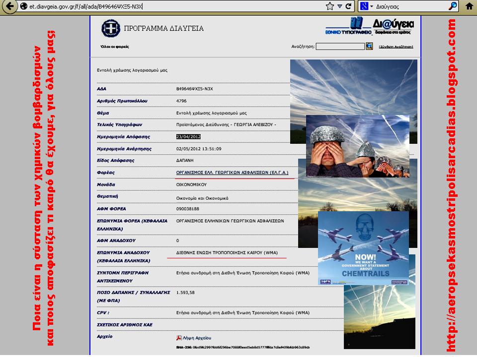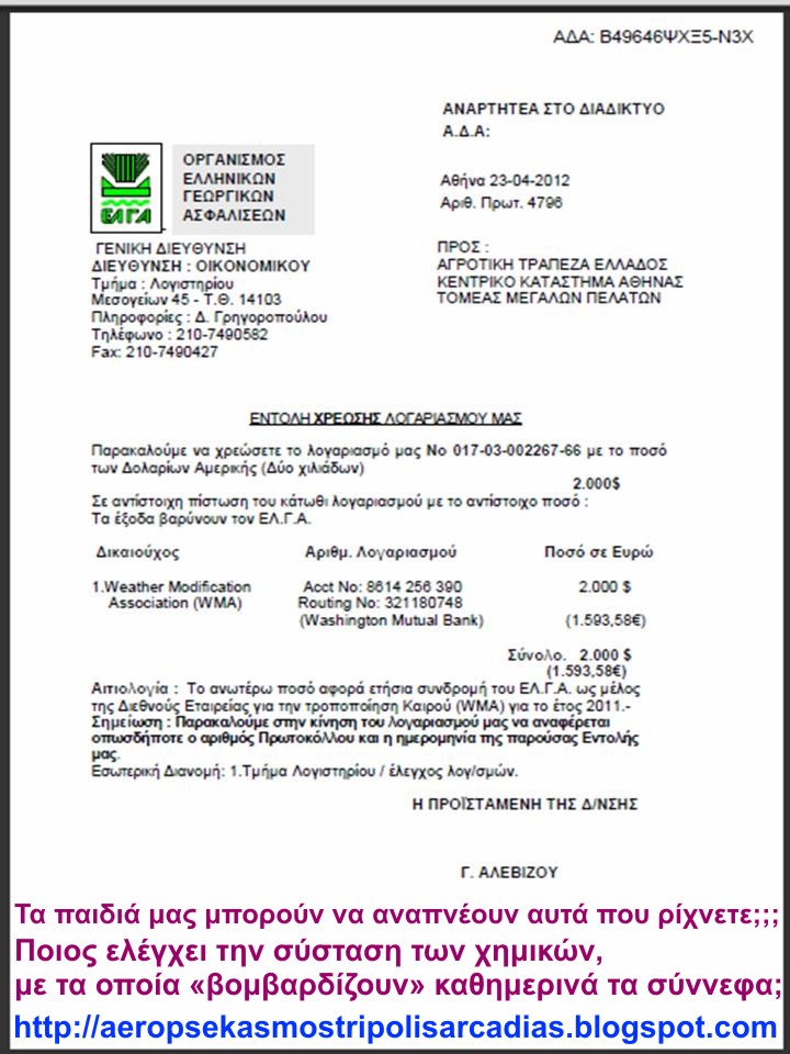 4. Το έγγραφο Εντολής Χρέωσης Λογαριασμού του ΕΛ.Γ.Α., με το ποσό των 1.593,58 ευρώ, ως ετήσια συνδρομή του ΕΛ.Γ.Α. ως μέλος της Διεθνούς Εταιρείας για την τροποποίηση Καιρού (WMA) για το 2011. Το έγγραφο υπογράφεται από την προϊσταμένη της Δ/νσης του ΕΛ.Γ.Α., Γ. Αλεβίζου και δημοσιεύτηκε στην ιστοσελίδα της «Διαύγειας»(!) την 23/04/2012, με αριθμ. πρωτ. 4796, ίσως κατά λάθος… και ρωτούμε: