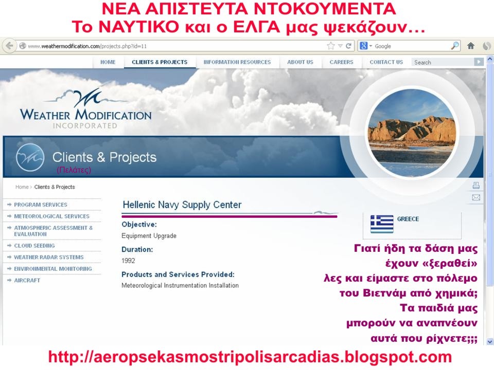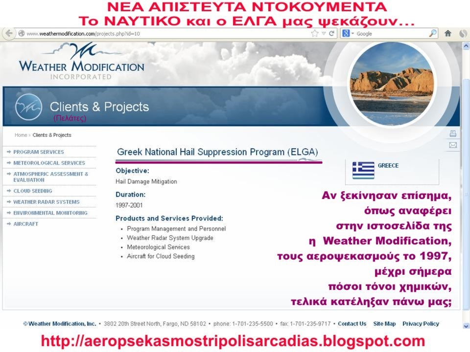 3. Την ιστοσελίδα http://weathermodification.com της κολοσσιαίας διεθνούς εταιρείας Weather Modification, που βρίσκεται στην Αμερική και επίσης ψεκάζει την ατμόσφαιρα και προσφέρει τεχνογνωσία και υλικά, για κλιματική αλλαγή. Έχει όπως διαφημίζει η ίδια η εταιρεία, πελάτες της από την Ελλάδα, τον ΕΛ.Γ.Α. (1997-2001) και το Ελληνικό Ναυτικό Κέντρο Προμηθειών (1992). Ειδικά στον ΕΛ.Γ.Α. δίδει όπως αναφέρει αεροπλάνα για βομβαρδισμό των σύννεφων (Aircraft for Cloud Seeding)(!) και ρωτούμε: