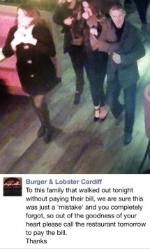 Το υποκατάστημα της Burger & Lobster στο Κάρντιφ, που άνοιξε πρόσφατα, πόσταρε μια φωτογραφία της τετραμελούς οικογένειας στο Facebook, καλώντας τους να πληρώσουν.