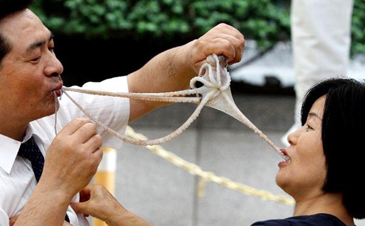Μάλλον από τα πιο αηδιαστικά γεύματα που έχουμε δει. Τρώγονται πολύ συχνά σε Ιαπωνία και Κίνα. Μάλιστα είναι και εξαιρετικά δύσκολο να φαγωθεί καθώς κινείται συνεχώς και επικίνδυνο καθώς οι βεντούζες του χταποδιού μπορούν να κολλήσουν οπουδήποτε κατά την ώρα του γεύματος. Δεν φαίνεται πάντως αυτό να απασχολεί και πολύ τους Κινέζους και Γιαπωνέζους που το απολαμβάνουν.