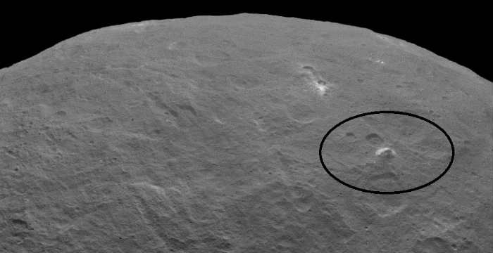 Σε φωτογραφίες που τράβηξε η συσκευή τις 19 Φεβρουαρίου διακρίνονται δύο περιοχές με υψηλή λευκαύγεια μέσα σε ένα κρατήρα, των οποίων η ανακλαστικότητα θεωρείται ότι οφείλεται στην παρουσία πάγου ή αλάτων