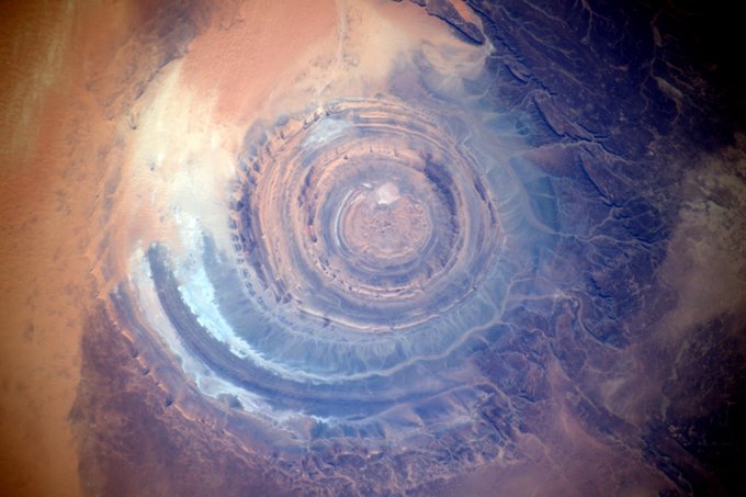 Mία συγκλονιστική φωτογραφία στην οποία απεικονίζονται οι ελικοειδείς σχηματισμοί του «ματιού της Αφρικής», γνωστού επίσης κι ως σχηματισμός «Richat», ελήφθη από τον Γάλλο αστροναύτη της ΕSA, Thomas Pesquet στον Διεθνή Διαστημικό Σταθμό (ΙSS).