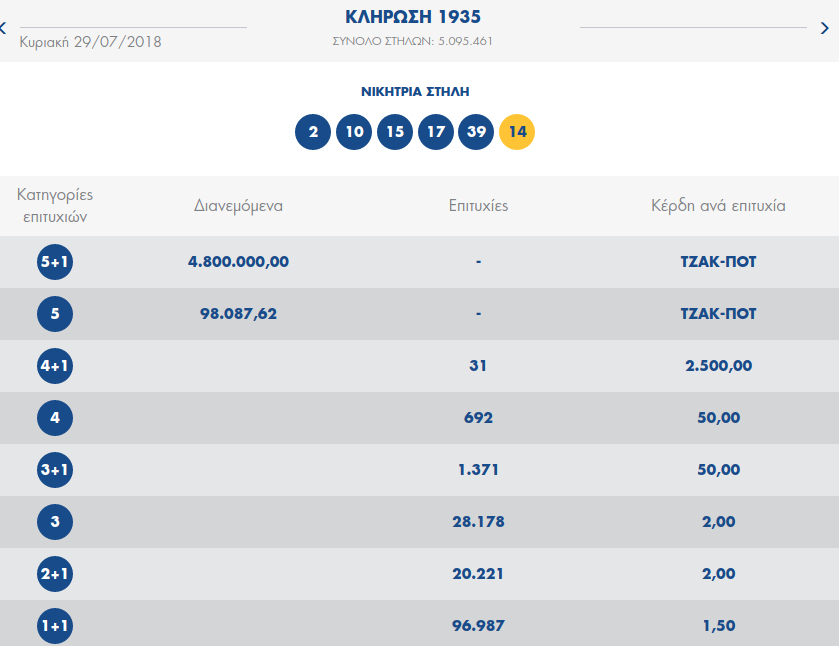 Ετσι, την Πέμπτη θα μοιράσει πάνω από 5,4 εκατ.ευρώ στην 1η κατηγορία. Τζακ ποτ σημειώθηκε και στη δεύτερη κατηγορία.