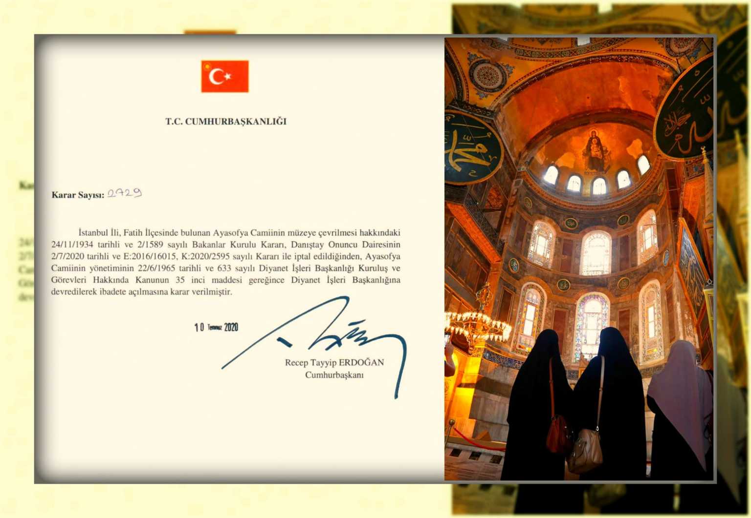 «Αποφασίστηκε ότι η Αγία Σοφία θα τεθεί υπό την εποπτεία της Ντιγιανέτ (Αρχή Θρησκευτικών Υποθέσεων) και θα ξανανοίξει για προσευχή», αναφέρει το διάταγμα που υπέγραψε ο Ταγίπ Ερντογάν.