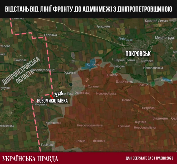 Απομένουν λιγότερα από δύο χιλιόμετρα πριν ο πόλεμος εξαπλωθεί σε μια γειτονική περιοχή, κάτι που προς το παρόν φαίνεται πιο ρεαλιστικό από την περικύκλωση του ίδιου του Ποκρόφσκ. Οι πλησιέστεροι Ρώσοι στην περιοχή του Ντνιεπροπετρόφσκ βρίσκονται στην περιοχή του χωριού Νοβομικολάιβκα.