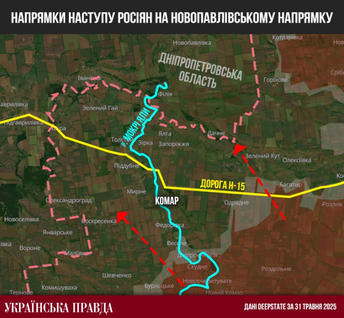 Οι Ρώσοι προσπαθούν να κινηθούν κατά μήκος του ποταμού Μόκρι Γιάλι προς το χωριό Κομάρ και τον δρόμο H-15, προκειμένου να πλησιάσουν ξανά την περιοχή του Ντνιεπροπετρόφσκ και να μεταφέρουν τις εχθροπραξίες σε αυτήν και από αυτήν την πλευρά.
